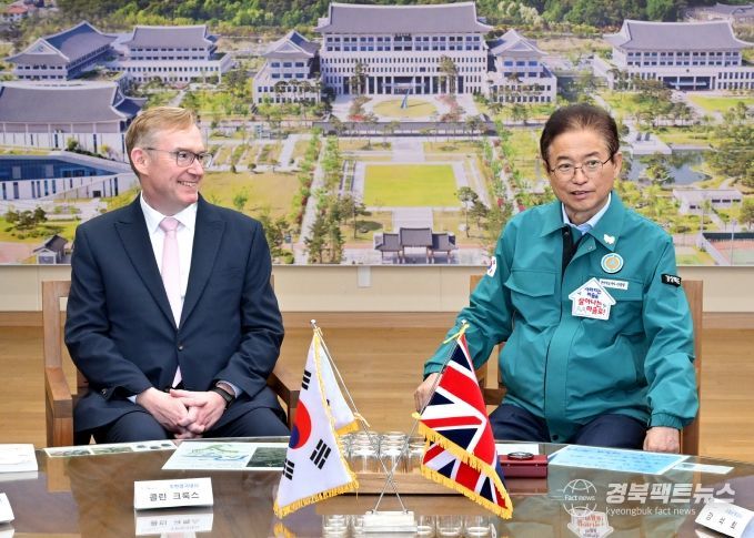 경북팩트뉴스 남유신 기자 | 이철우 경상북도지사는 3일 도청을 방문한 콜린 크룩스(Colin Crooks) 주한 영국대사 내외와 만나, 경주 APEC 정상회의의 성공적 개최 협력 방안과 함께 산업·문화·교육 등 다양한 분야의 교류 확대를 논의했다.