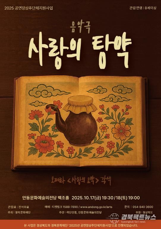올해 선정된 상주단체 ‘극단안동’은 한국적 소재를 바탕으로 연극과 뮤지컬, 음악극, 거리 퍼포먼스 등 다양한 장르를 넘나들며 활발한 창작 활동을 이어가고 있다. 창작 음악극 '사랑의 탕약'은 10월 17일 오후 7시 30분과 18일 오후 7시, 양일에 걸쳐 안동문화예술의전당 백조홀 무대에서 열린다.
