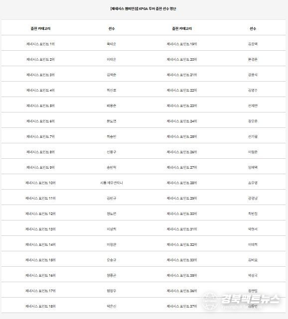 제네시스 포인트 1위 옥태훈(27.금강주택)을 비롯해 2위 이태훈(35.캐나다), 3위 김백준(24.속초아이), 4위 최진호(41.COWELL), 5위 배용준(25.CJ), 6위 문도엽(34.DB손해보험), 7위 최승빈(24.CJ), 8위 신용구(34.금강주택), 9위 송민혁(21.CJ), 10위 사돔 깨우깐자나(27.태국)까지 제네시스 포인트 TOP10 선수들과 36위 정한밀(34.경희), 37위 김동민(27.NH농협은행)까지 제네시스 포인트 상위 36명이 참가자 명단에 이름을 올렸다.