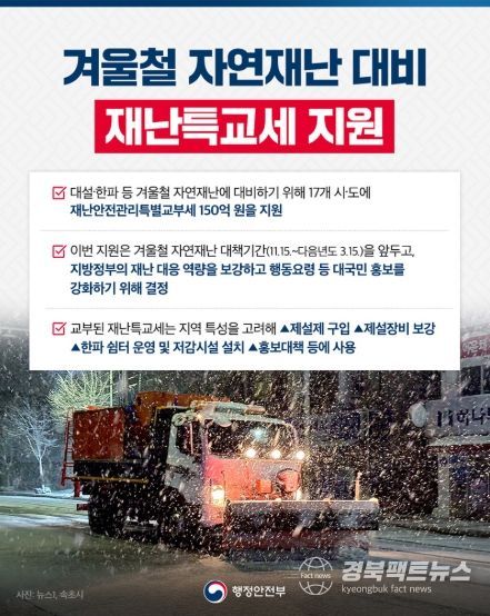 경북팩트뉴스 이경원 기자 | 겨울철 자연재난 대비 재난특교세 지원