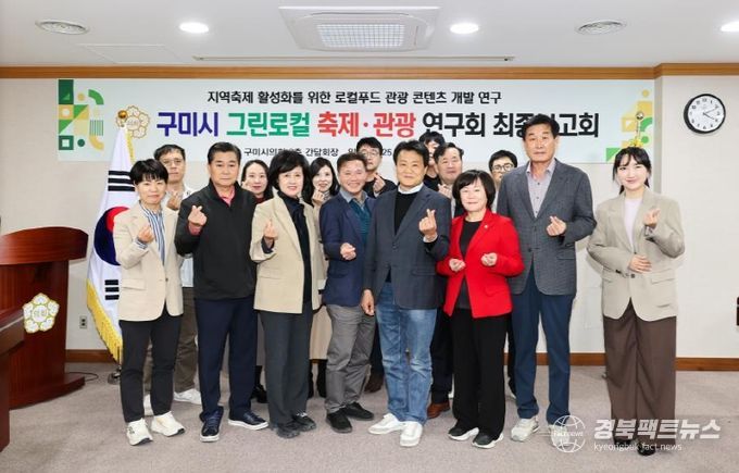 경북팩트뉴스 조현묵 기자 | 구미시의회 의원연구단체 ‘구미 그린로컬 축제·관광 연구회’(대표의원 김영태)는 10월 30일 오후 4시, 구미시의회 3층 간담회장에서 '로컬푸드를 활용한 축제 콘텐츠 개발을 통한 관광 활성화 방안 연구' 최종보고회를 개최했다.