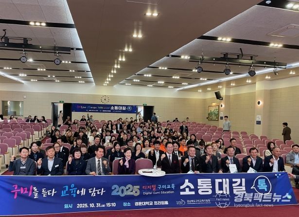 경북팩트뉴스 조현묵 기자 | 경상북도구미교육지원청은 10월 31일 금요일 경운대학교 프라임홀에서 도의회 의원, 경상북도교육청연수원장, 경상북도교육청구미도서관장, 관내 유·초·중·고등학교 교(원)장 대표, 학교운영위원장협의회, 학부모회협의회, 녹색어머니회, 구미학생안전자원봉사자회, 학부모자원봉사자회, 학생선도단, 학원연합회, 주민감사관, 교육계 원로, 교육발전특구 관계자 등 구미 교육가족 300여 명을 초청하여 ‘2025 교육감과 함께하는 구미교육 소통대길 톡’을 개최했다.