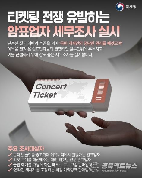 경북팩트뉴스 이경원 기자 | 단순한 질서 위반의 수준을 넘어 '국민 개개인의 정당한 권리를 빼앗으며' 이득을 챙겨 온 암표업자들의 관행적인 탈루행위에 주목하고, 이를 근절하기 위해 강도 높은 세무조사를 실시합니다.