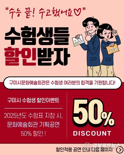 경북팩트뉴스 조현묵 기자 | 구미시는 2025학년도 대학수학능력시험을 마친 수험생들을 위해 ‘수험생 특별할인 이벤트’를 진행한다.