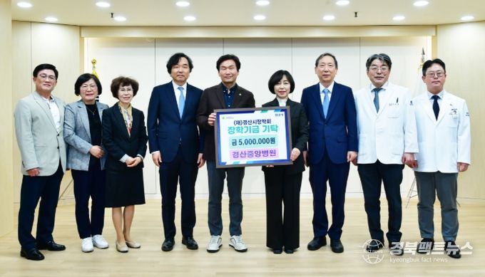 경북팩트뉴스 남유신 기자 | (재)경산시장학회(이사장 조현일)는 14일 의료법인 근원의료재단 경산중앙병원(이사장 정민혜)에서 지역인재 육성을 위한 장학금 500만 원을 기탁했다고 밝혔다.