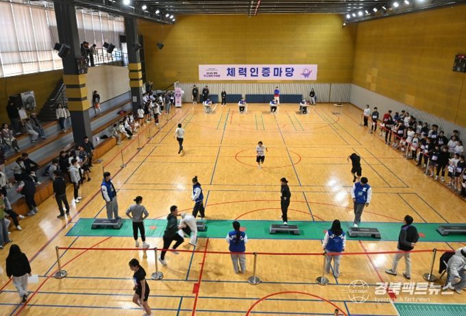 체력 인증 마당에는 도내 교육지원청에서 선발된 800여 명의 학생이 참여해 △앉아윗몸앞으로굽히기 △제자리멀리뛰기 △악력 △순환운동 △50m 달리기 등 5개 종목 측정 후 학년별․성별 ‘체력왕’을 선발했다.