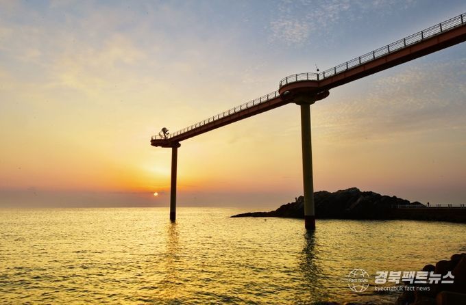 비단결 후포 바다를 가르며 존재감을 뿜어내는 후포 등기산 스카이 워크.그리고 비단결 후포 바다 위에 내린 새벽 첫 빛이 장관을 연출한다.