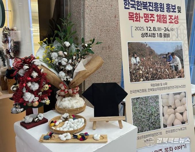 경북팩트뉴스 남유신 기자 | 한국한복진흥원 입주기업 누미한은 12월 8일부터 12월 24일까지 진흥원 내 목화밭에서 재배한 목화솜과 명주천을 활용한 체험형 전시를 상주시청 로비에서 진행한다.