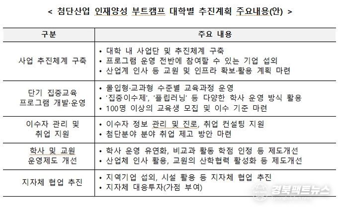경북팩트뉴스 남유신 기자 | 교육부와 한국산업기술진흥원(원장 민병주)은 12월 11일에 ‘2026년 첨단산업 인재양성 부트캠프’ 운영계획을 발표하고, 공고를 통해 참여대학을 모집한다.