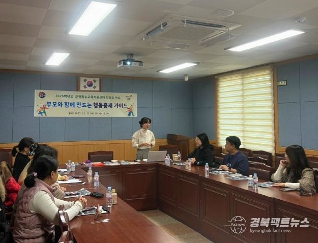 경북팩트뉴스 남유신 기자 | 대구군위교육지원청은 12월 17일 특수교육대상학생의 도전 행동을 이해하고 가정에서 실천할 수 있는 행동지원 전략을 안내하기 위해 ‘부모와 함께 만드는 행동중재 가이드’ 연수를 실시했다.