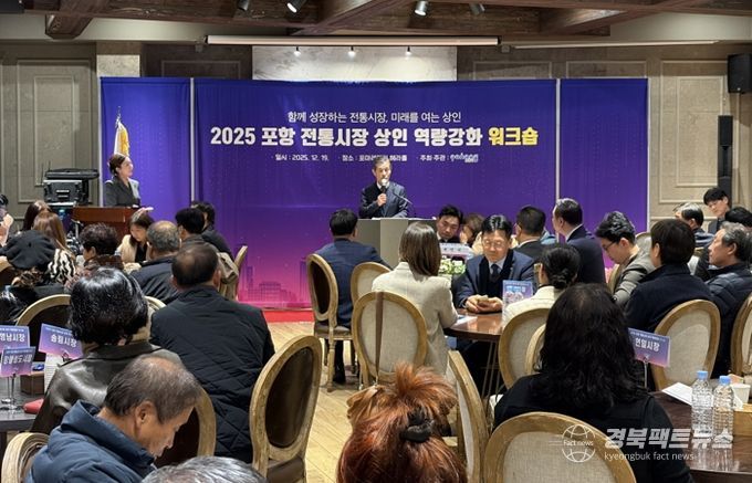 경북팩트뉴스 남유신 기자 | 포항시는 지난 19일 포마레웨딩컨벤션에서 서재원 포항시 정무특보, 임주희 포항시의회 경제산업위원장을 비롯해 지역 전통시장 상인회 임원 등 관계자 100여 명이 참석한 가운데 2025년 ‘포항시 전통시장 상인 역량강화 워크숍’을 개최했다.