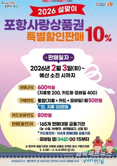 경북팩트뉴스 남유신 기자 | 포항시는 설 명절을 맞아 민생경제에 활력을 불어넣기 위해 내달 3일부터 포항사랑상품권 600억 원을 10% 특별할인 판매한다.