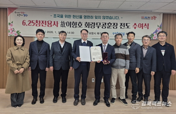 경북팩트뉴스 남유신 기자 | 포항시 북구청은 27일, 6·25전쟁에 참전해 무공을 세운 故 이형호 일병의 유족에게 국방부장관을 대신해 화랑무공훈장을 전수했다.