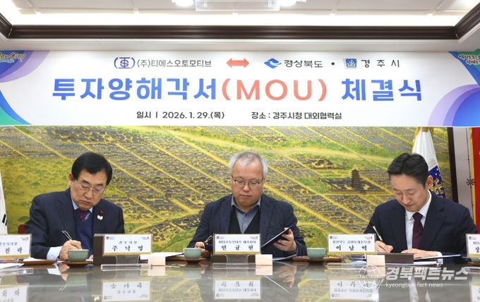 경주시는 29일 시청 대외협력실에서 경북도와 함께 자동차 차체 부품 전문기업 ㈜티에스오토모티브 간 전기차 신차종 제품 생산라인 구축을 위한 투자양해각서(MOU)를 체결했다.