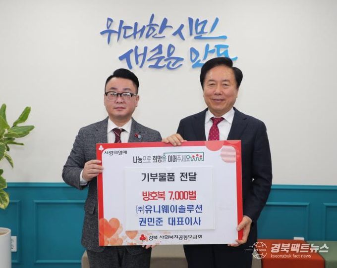 안동시는 1월 28일 시장실에서 권기창 안동시장과 ㈜유니웨이솔루션 권민준 대표이사가 참석한 가운데, 2026년 여름철 현장 작업자들의 안전을 위한 방호복 7,000벌 기탁식을 가졌다고 밝혔다.