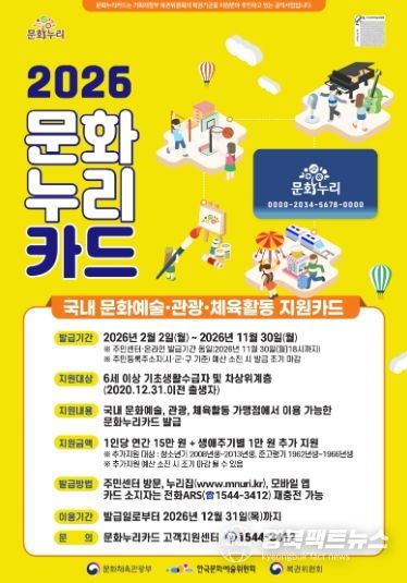 시 관계자는 “문화누리카드 지원 확대를 통해 문화취약계층의 문화 향유 기회가 확대되길 기대한다”며, “앞으로도 생애주기별 맞춤형 정책을 지속적으로 추진하고 홍보하겠다”고 말했다.