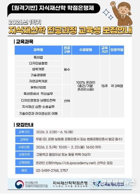 경북팩트뉴스 남유신 기자 | 지식재산처 국제지식재산연수원은 한국발명진흥회와 공동으로 2월 5일부터 23일까지 지식재산학 학점은행 과정에 대한 온라인 수강생을 모집한다.