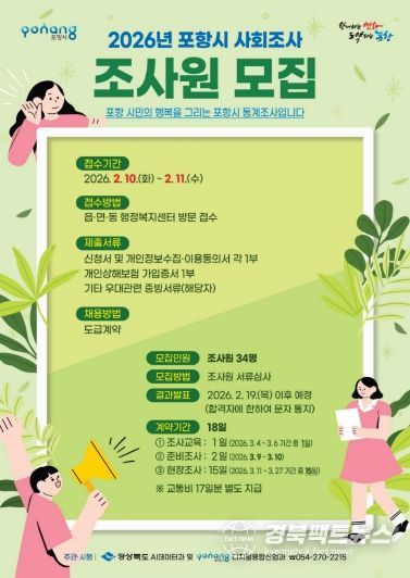 경북팩트뉴스 남유신 기자 | 포항시는 ‘2026년 경상북도 및 포항시 사회조사’에 참여할 조사원 34명을 모집한다.