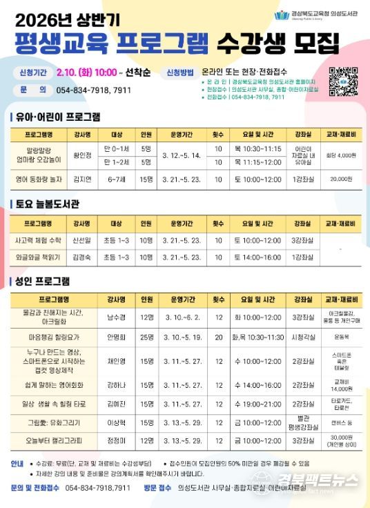 경북팩트뉴스 남유신 기자 | 경상북도교육청 의성도서관은 지역주민의 평생학습 기회를 확대하고 삶의 질 향상을 도모하기 위해 2월 10일(화)부터 상반기 평생교육 프로그램 수강생을 모집한다고 밝혔다.