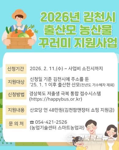경북팩트뉴스 남유신 기자 | 김천시는 오는 11일부터 ‘2026년 출산모 농산물 꾸러미 지원사업’신청ㆍ접수를 시작한다.