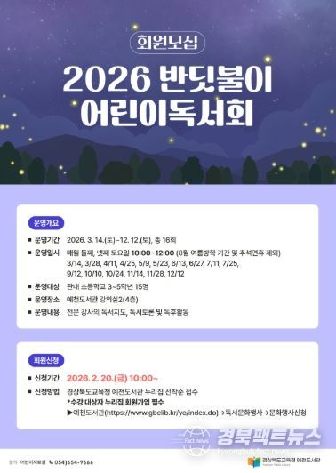 경북팩트뉴스 남유신 기자 | 경상북도교육청 예천도서관은 이달 2월 20일부터 예천군 관내 초등학교 3~5학년을 대상으로 2026년 반딧불이 독서회원을 모집한다.