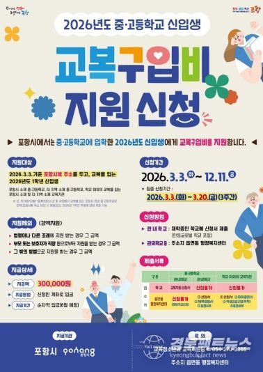 경북팩트뉴스 남유신 기자 | 포항시는 교육의 공공성 강화와 학부모 교육비 부담 완화를 위해 2026학년도 중·고등학교 신입생 교복 구입비 지원 신청을 내달 3일부터 접수한다.