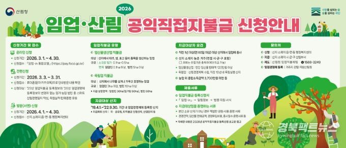 경북팩트뉴스 남유신 기자 | 울진군은 임업·산림의 공익적 기능을 증진하고 임업인의 소득 안정을 도모하기 위해 2026년 임업·산림 공익직접지불금신청을 오는 3월부터 접수한다.