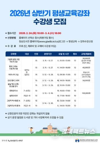 경북팩트뉴스 남유신 기자 | 경상북도교육청 청송도서관은 일상 속에서 배움의 즐거움을 발견하고, 배움으로 삶의 활력을 찾도록 ‘상반기 평생교육강좌'를 마련했다.
