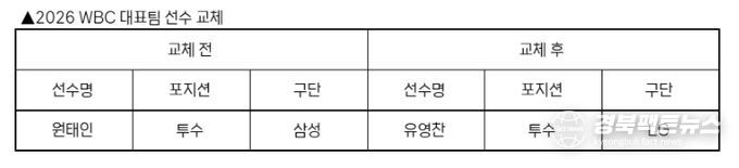 경북팩트뉴스 남유신 기자 | KBO 전력강화위원회는 부상으로 인해 WBC 참가가 어려워진 삼성 원태인을 대체할 선수로 LG 유영찬을 확정하고 WBC 조직위에 선수 교체 승인을 요청했다.