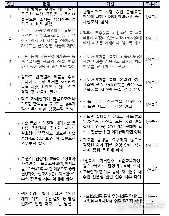먼저, 학생에게 교내 상장을 수여할 때 공무원의 포상 규정을 적용하여 공적 조서를 작성하는 등 관행적으로 해오던 불필요한 업무를 시정하도록 현장에 안내한다. 1급 정교사 자격연수에서 법정의무교육을 과도하게 편성하던 관행을 개선해 전문성 향상을 위한 과목을 확대할 예정이다.