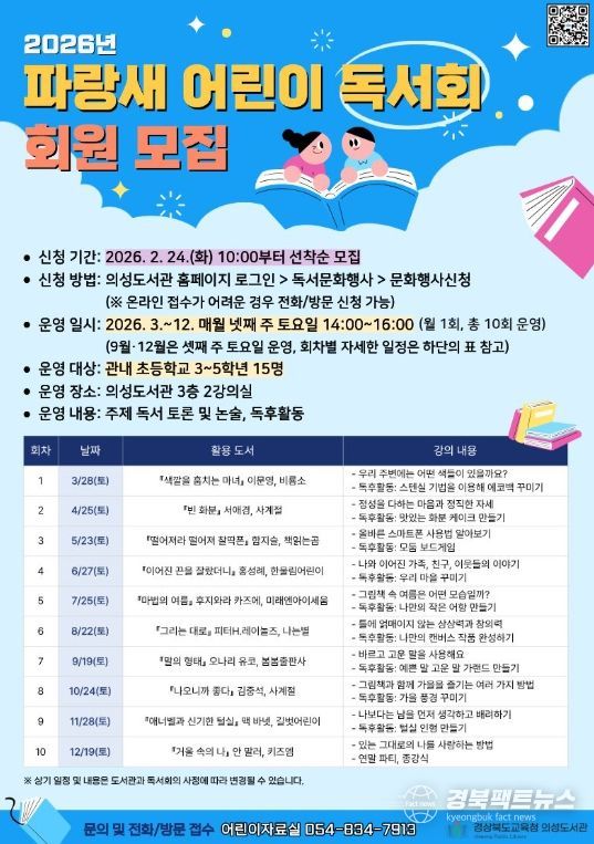 경북팩트뉴스 남유신 기자 | 경상북도교육청 의성도서관은 오는 24일부터 ‘2026년 파랑새 어린이 독서회’ 신규 회원을 모집한다.