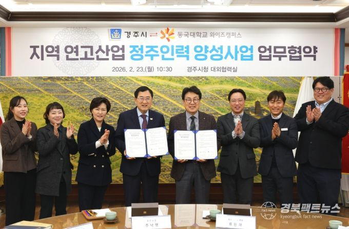 경주시는 23일 시청 대외협력실에서 동국대학교 WISE캠퍼스와 ‘지역 연고산업 정주인력 양성사업’ 추진을 위한 업무협약을 체결했다고 24일 밝혔다.