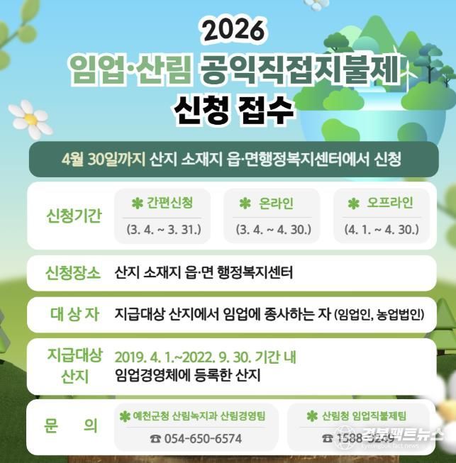 경북팩트뉴스 남유신 기자 | 예천군은 임업인의 소득 안정과 산림의 공익기능 증진을 위해 4월 30일까지 ‘2026년 임업·산림 공익직접지불금’ 신청을 받는다.
