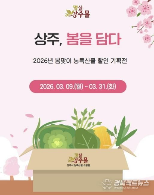 이번 기획전은 2026년 3월 9일부터 3월 31일까지 진행되며, 상주시 공식 온라인몰인 명실상주몰을 통해 나물류, 버섯류 등 봄철 농특산물 먹거리를 20% 할인된 가격으로 판매한다.