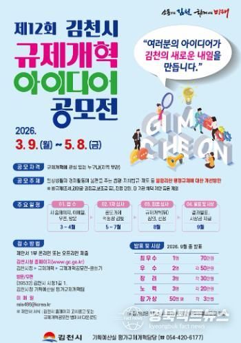 경북팩트뉴스 남유신 기자 | 김천시는 시민의 아이디어를 바탕으로 일상생활과 기업활동 과정에서 발생하는 불합리한 규제를 개선하기 위해 제12회 규제개혁 아이디어 공모전을 개최한다.