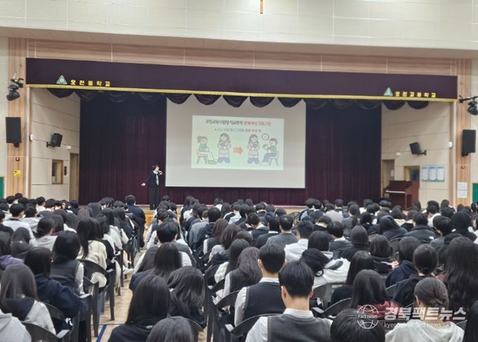 경북팩트뉴스 남유신 기자 | 경상북도포항교육지원청은 새 학기를 맞아 관내 고등학교를 대상으로 안전하고 평화로운 학교 문화 조성을 위한 ‘찾아가는 맞춤형 학교폭력 예방교육’을 3월 23일 오천고등학교 전교생 570여 명을 대상으로 실시했다.