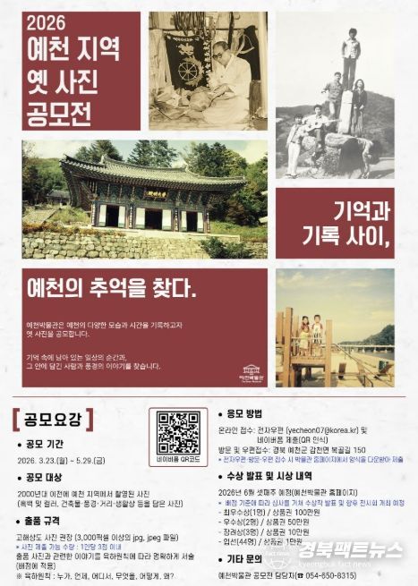김상식 문화관광과장은 “이번 공모전은 개인이 간직해 온 사진을 통해 예천의 시간과 기억을 모으는 자리”라며 “지역민의 많은 참여로 예천의 소중한 기록이 발굴되고 공유되길 기대한다”고 말했다.