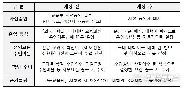 기존에는 국내 대학이 프랜차이즈를 운영하기 위해서 교육부의 사전 승인을 받아야 했으나, 2024년 2월 고등교육법 시행령 개정으로 대학 간 협약만으로도 운영이 가능해졌다. 교육과정의 구성과 수업 운영도 각 대학이 학칙으로 자율적으로 정할 수 있게 되어 현장에서 ‘프랜차이즈’ 운영의 추진력이 높아졌다.