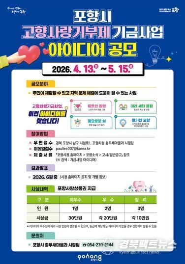 경북팩트뉴스 남유신 기자 | 포항시가 기부자의 소중한 마음을 지역의 희망으로 전환하기 위해 ‘2026년 포항시 고향사랑기부제 기금사업 아이디어’를 공개 모집한다.