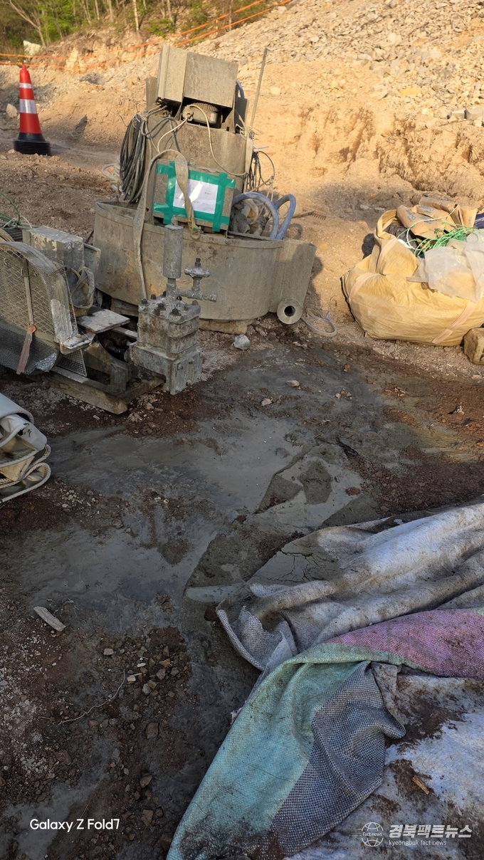현장에서는 그라우팅 주입기로 추정되는 장비를 세척하는 과정에서 발생한 시멘트 잔여물과 폐수가 별도의 처리 절차 없이 그대로 외부로 배출되고 있는 정황이 확인됐다. 시멘트 성분이 포함된 세척수는 토양과 수질 오염을 유발할 수 있어 적정 처리시설을 통한 관리가 필수적이지만, 해당 현장에서는 이를 통제하는 장치나 별도 조치가 확인되지 않았다는 지적이다.