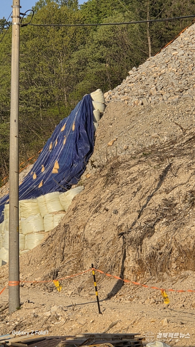 비탈면 안전관리 역시 미흡한 상태로 드러났다. 현장에는 방수포와 모래, 자루 등이 임시로 쌓여 있었으나 구조적으로 고정되지 않은 채 방치돼 있어 붕괴 위험이 큰 상황이다. 일부 구간은 작은 충격에도 무너질 수 있는 상태로 보인다는 우려가 제기된다.
