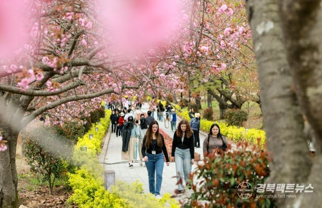 경북팩트뉴스 남유신 기자 | 경주 불국사공원 겹벚꽃이 만개를 앞두고 분홍빛 물결을 이루며 상춘객들의 발길을 끌고 있다.