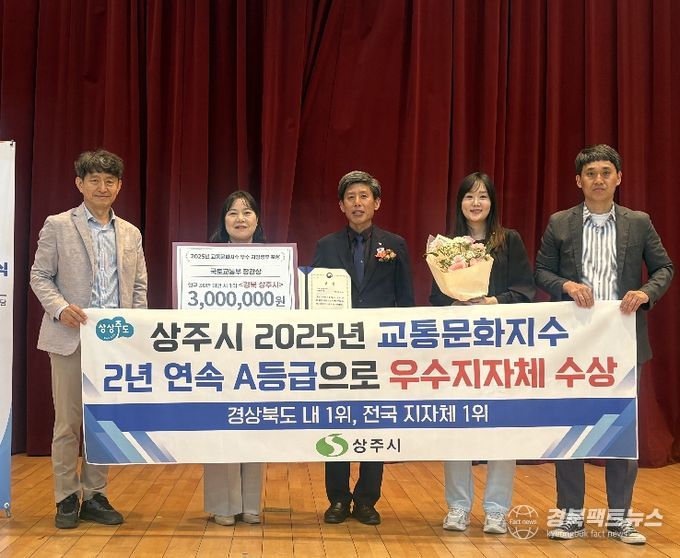 교통문화지수는 국토교통부가 매년 전국 229개 기초 지자체를 대상으로 지자체의 교통안전 행정노력도, 운전행태, 보행행태 등에 대한 객관적 조사를 통해 지자체별 교통문화 수준을 분석·평가하여 지역 교통문화 의식을 나타내는 대표적인 지표로, 상주시는 지난 2022년 38위, 2023년 14위로 B등급을 받았고 2024년 3위로 A등급을 받았으며 마침내 2025년 인구 30만 미만 시 그룹 49개 지자체 중 경북도 내 1위, 전국 순위 1위로 수상하게 됐다.