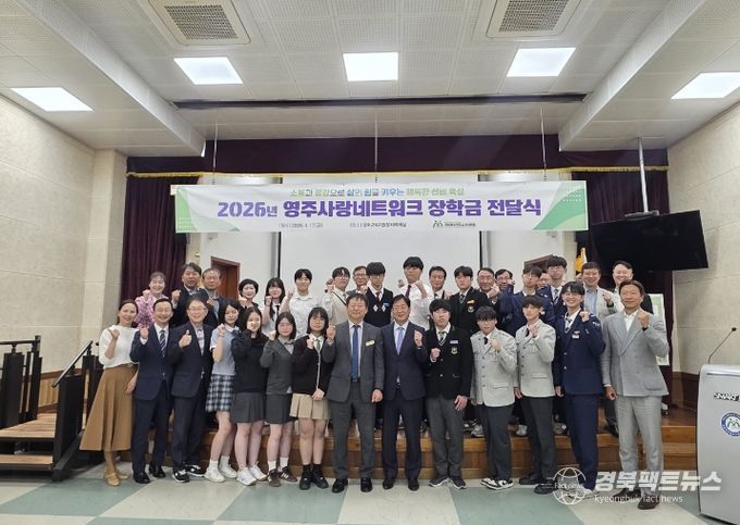 경북팩트뉴스 남유신 기자 | 재경 영주 출신 재계, 관계, 법조계, 학계, 언론계 인사들의 모임인 영주사랑네트워크 (회장 이종오)가 4월 17일 영주교육지원청에서 영주지역 9개 고등학교 학생 20명에게 1,000만원의 장학금을 전달했다.