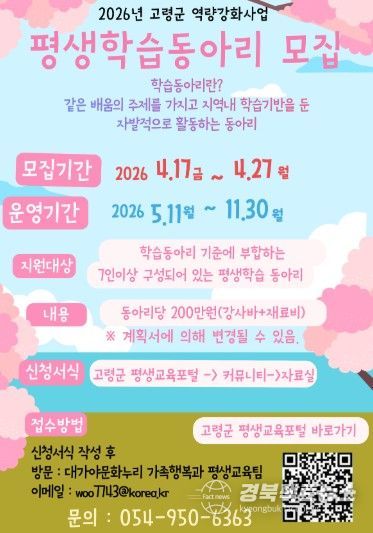 경북팩트뉴스 남유신 기자 | 고령군은 지역 주민의 학습 열기를 확산하고 지속 가능한 학습 생태계를 조성하기 위해, 오는 4월 17일부터 27일까지 ‘2026년 고령군 역량강화 사업’의 일환인 '평생학습동아리' 10개 팀을 모집한다.