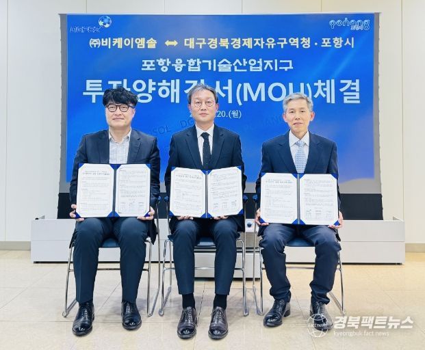 경북팩트뉴스 남유신 기자 | 포항시와 대구경북경제자유구역청은 20일 ㈜비케이엠솔과 포항융합기술산업지구 내 투자 유치를 위한 양해각서(MOU)를 체결했다.