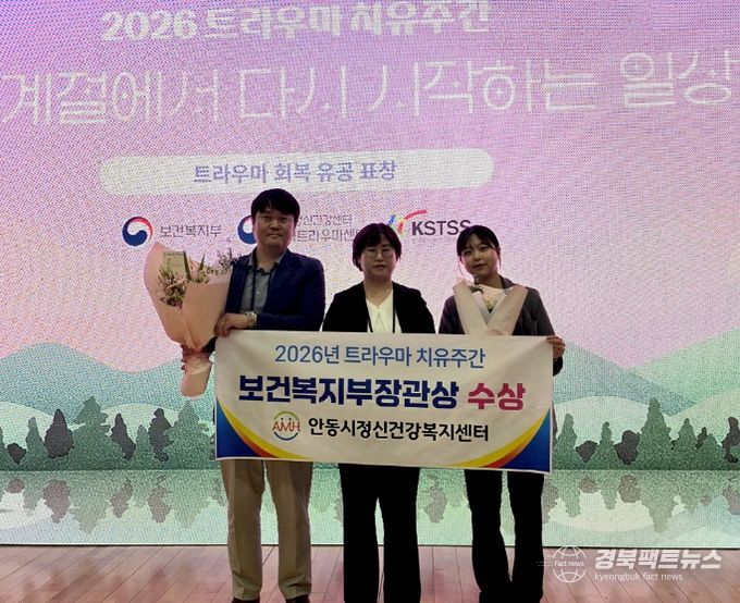경북팩트뉴스 남유신 기자 | 안동시정신건강복지센터는 20일 국립정신건강센터에서 열린 보건복지부 주최 ‘2026년 트라우마 치유주간’ 시상식에서, 산불 재난 경험자의 심리 회복을 위해 헌신한 공로를 인정받아 보건복지부 장관 표창을 수상했다고 밝혔다.