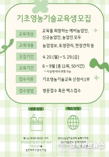 모집 기간은 다음 달 29일까지이며, 교육 신청을 희망하는 교육생들은 영덕군농업기술센터 농업기술과 지도육성팀을 방문하거나 팩스로 접수할 수 있다.