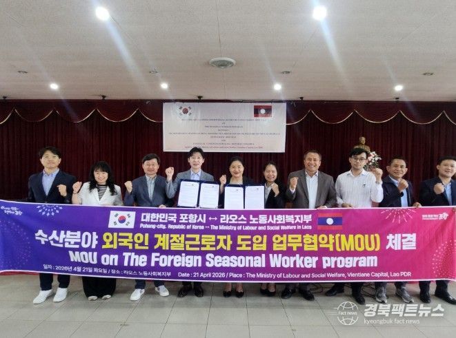 경북팩트뉴스 남유신 기자 | 포항시는 지역 내 과메기·오징어 건조 등 수산물가공업 분야의 인력 부족 문제를 해결하기 위해 21일(현지시간) 라오스 비엔티안에서 라오스 노동사회복지부와 ‘외국인 계절근로자 도입을 위한 업무협약(MOU)’을 체결했다.