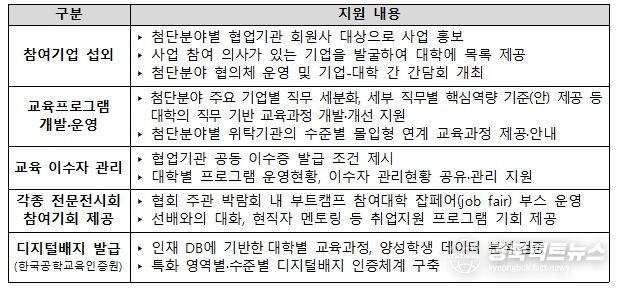 분야별 협업기관은 △참여기업 섭외, △교육프로그램 개발 및 운영, △교육 이수자 관리, △각종 전문 전시회 참여기회 제공 등 사업 운영의 전 단계에서 대학-기업의 교류를 활성화하고, 학생들을 지원하는 역할을 한다. 또한, 대학별 교육과정을 분석하여, 특화 영역별·수준별 디지털 배지 발급을 지원하는 등 인증 체계를 구축하기도 한다.